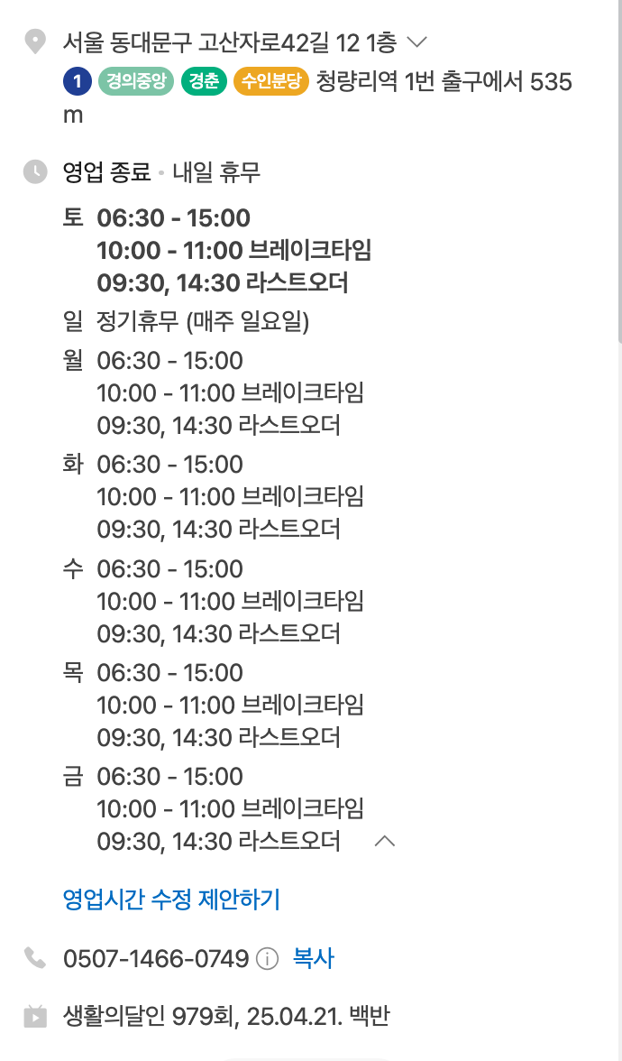 영업시간: 06:30~15:00 (정기휴무 매주 일요일)