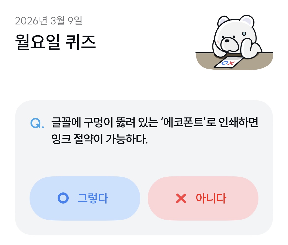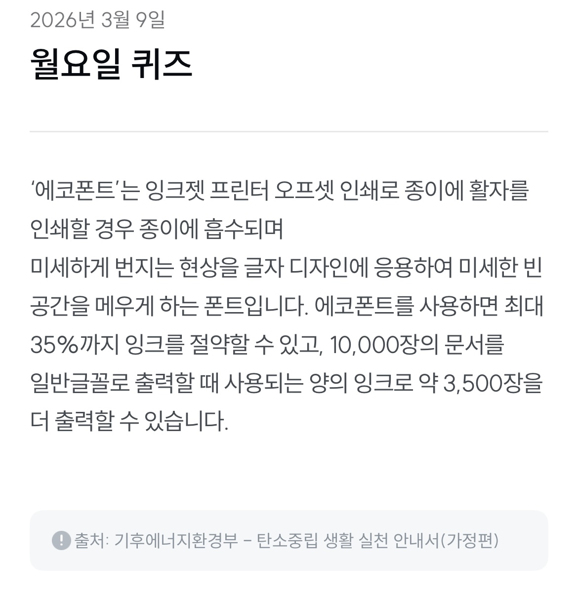 기후행동 퀴즈 3월 9일 정답 확인! 글꼴에 구멍이 뚫린 ‘에코폰트’로 인쇄하면 잉크 절약이 가능할까? 에코폰트 뜻과 인쇄 시 잉크 절약 효과까지 함께 정리했습니다.
