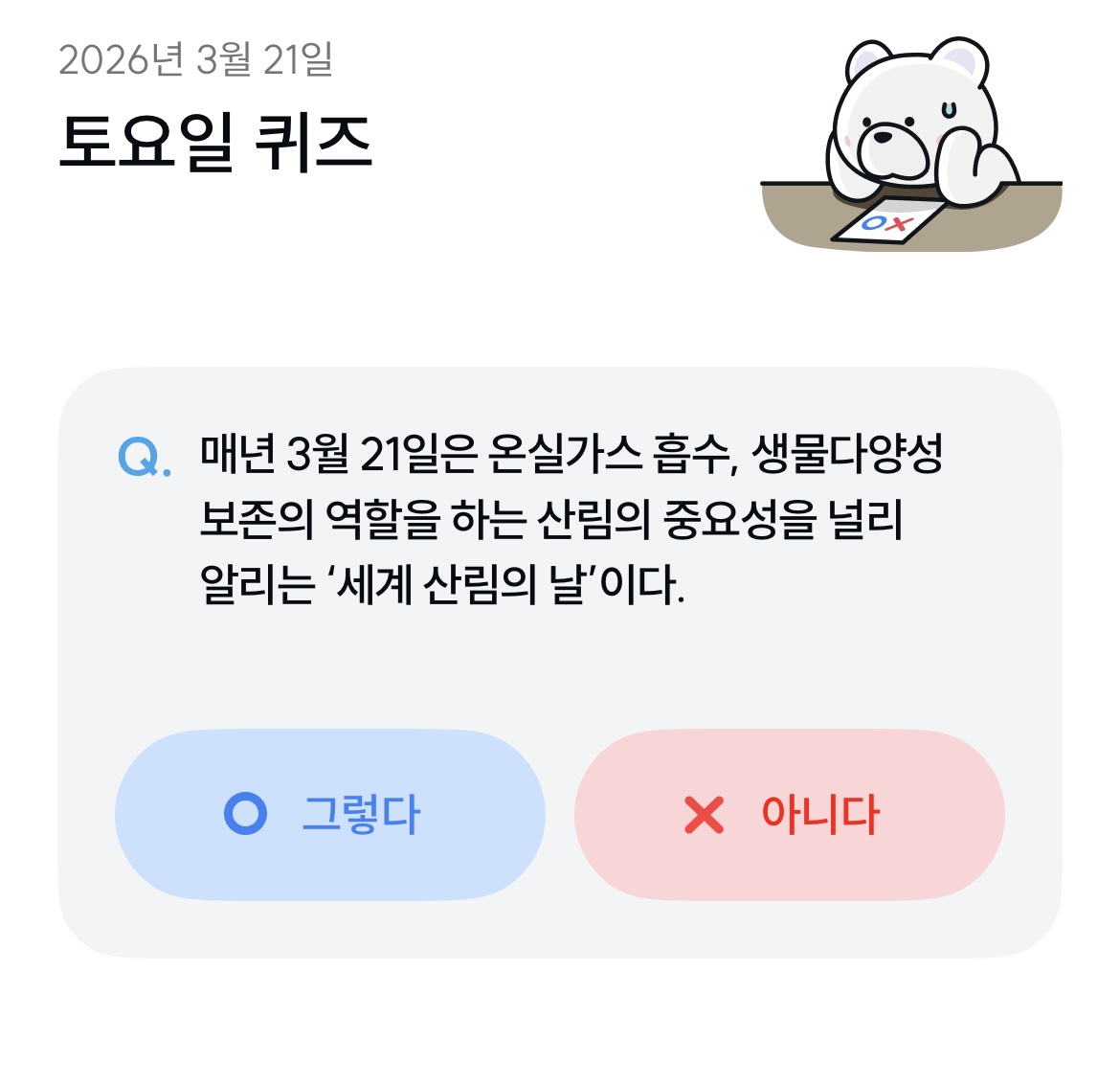 기후행동퀴즈 3월 21일 정답 확인! 매년 3월 21일은 ‘세계 산림의 날’이 맞을까? 정답과 함께 산림의 역할, 기후변화 대응 중요성까지 쉽게 정리했습니다.