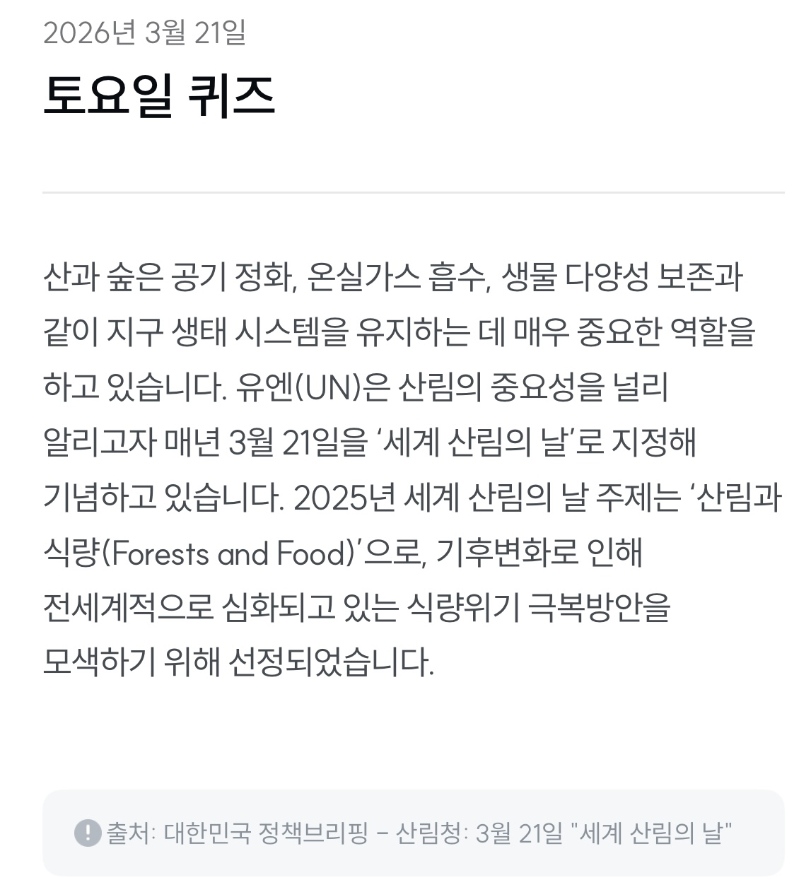 👉 “매년 3월 21일은 온실가스 흡수, 생물다양성 보존의 역할을 하는 산림의 중요성을 알리는 ‘세계 산림의 날’이다.”