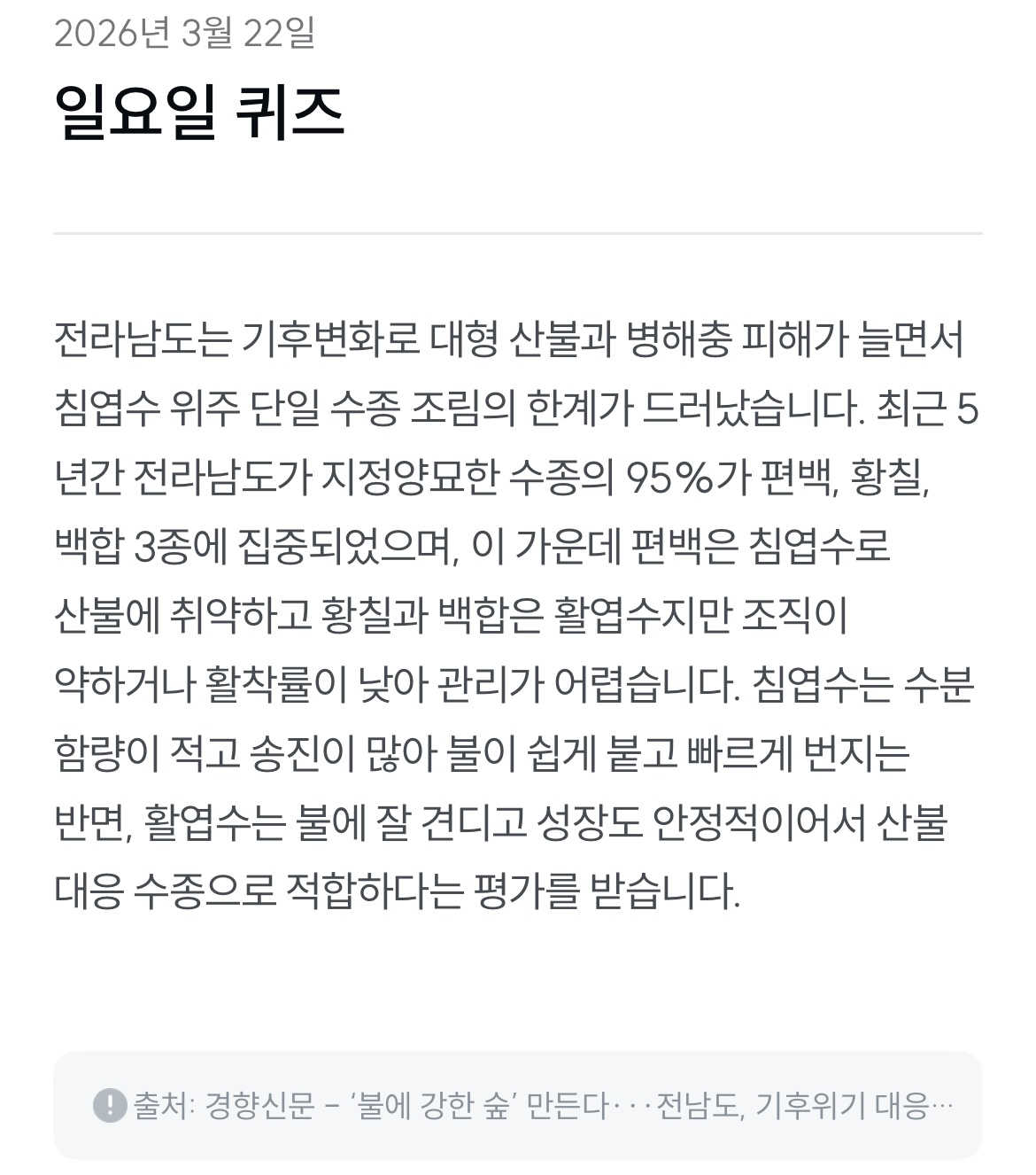 기후행동퀴즈 3월 22일 정답 확인! 기후위기 대응 숲 조성 시 나무 종류는 상관없을까? 정답과 함께 산불·생태계 대응을 위한 올바른 숲 조성 방법까지 쉽게 정리했습니다.