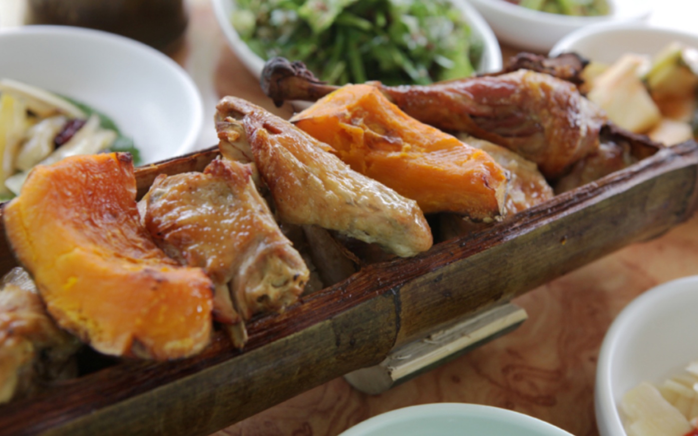 13가지 한약재와 댓잎을 달인 물로 조리한 대통오리구이입니다.