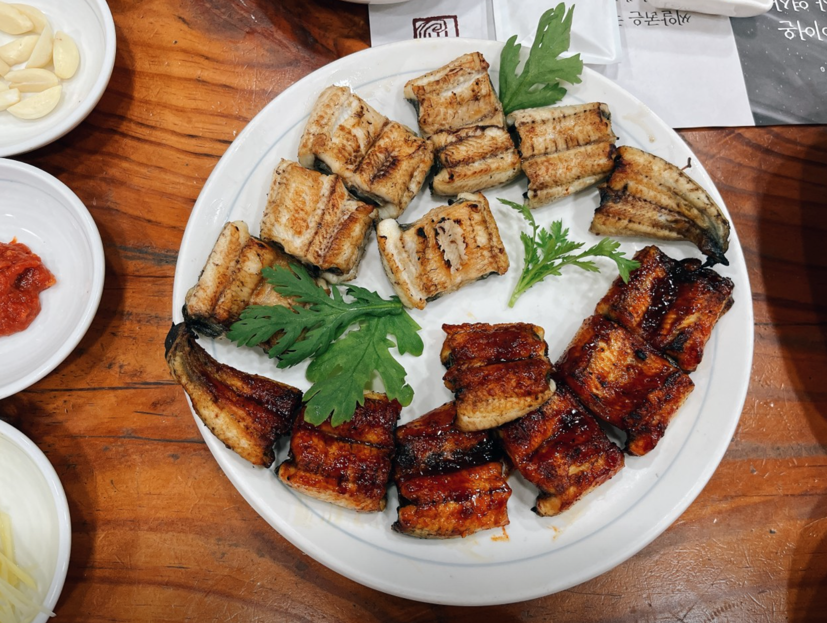 연탄 특유의 은은한 불향이 장어의 담백함과 어우러져 겉은 바삭하고 속은 촉촉한 식감을 만든다.