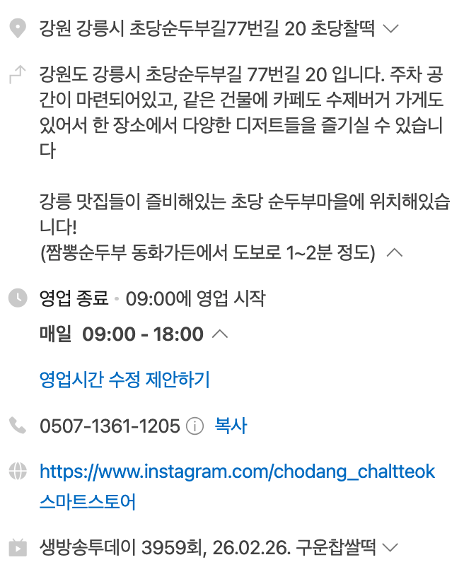 - 주소: 강원 강릉시 초당순두부길77번길 20