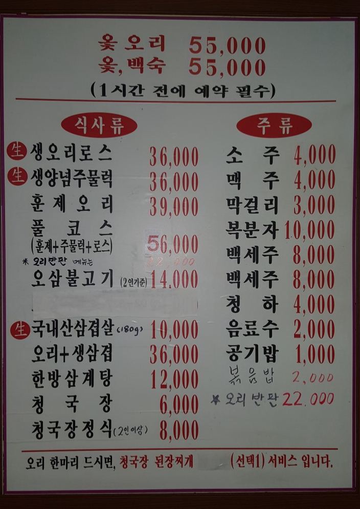메뉴 생오리로스 36,000 원 / 생양념주물럭 36,000 원