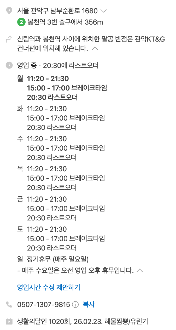영업시간 12:20~21:30 (정기휴무 매주 일요일)