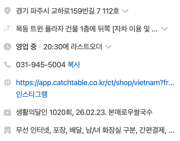 생활의 달인 1020회에 소개된 파주 비엣남 본점 위치 정보. 미국식 본매로우 쌀국수, 29시간 육수, 골수 쌀국수 메뉴와 영업시간 정리.