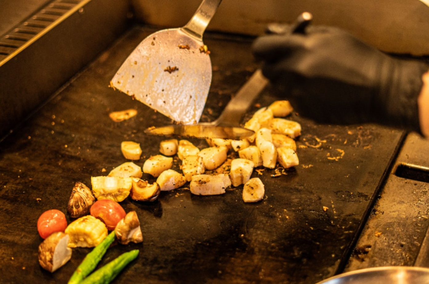 대형 철판 위에서 펼쳐지는 라이브 조리 퍼포먼스가 이 집의 시그니처입니다.
