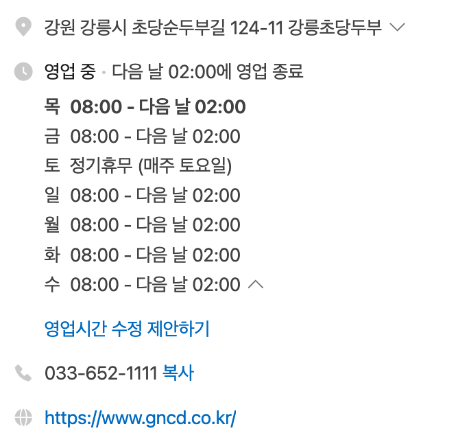 - 주소: 강원특별자치도 강릉시 초당순두부길 124-11
