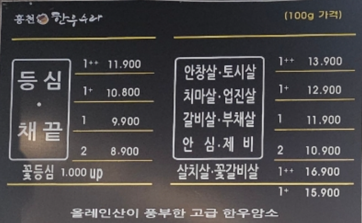 - 암소 한우 구이 (등심·채끝·안심·갈비 등)