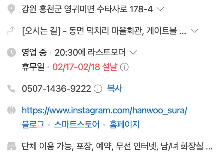 - 주소 : 강원 홍천군 영귀미면 수타사로 178-4