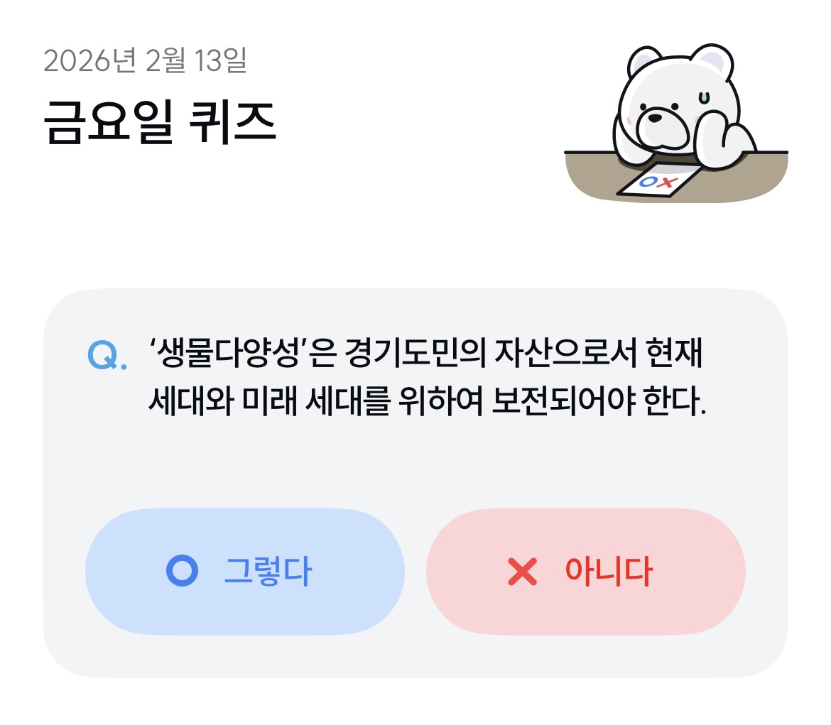 2월 13일 기후동행퀴즈, 기후행동 기회소득 퀴즈 정답-생물다양성은 경기도민의 자산으로서 현재 세대와 미래 세대를 위하여 보전되어야 한다?
