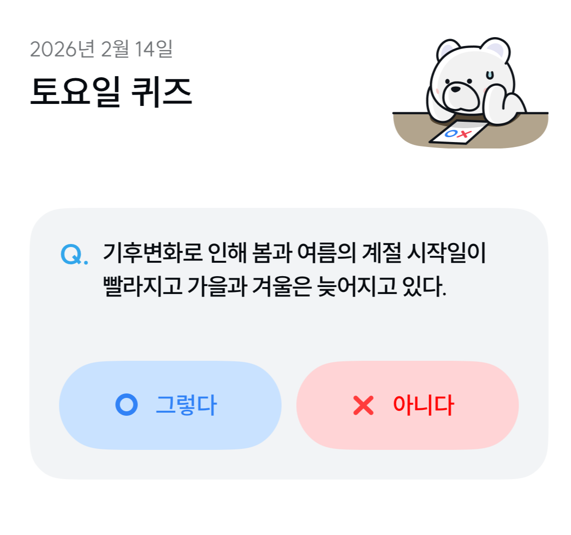 2026년 2월 14일 토요일 기후행동 기회소득 퀴즈 정답을 찾는 분들이 많습니다.